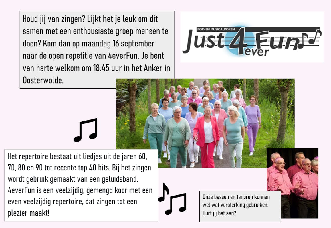 Just4Fun en 4everFun zijn swingende, enthousiaste en eigentijdse koren uit het Friese Oosterwolde. Wij zijn 2 enthousiaste pop- en musica......