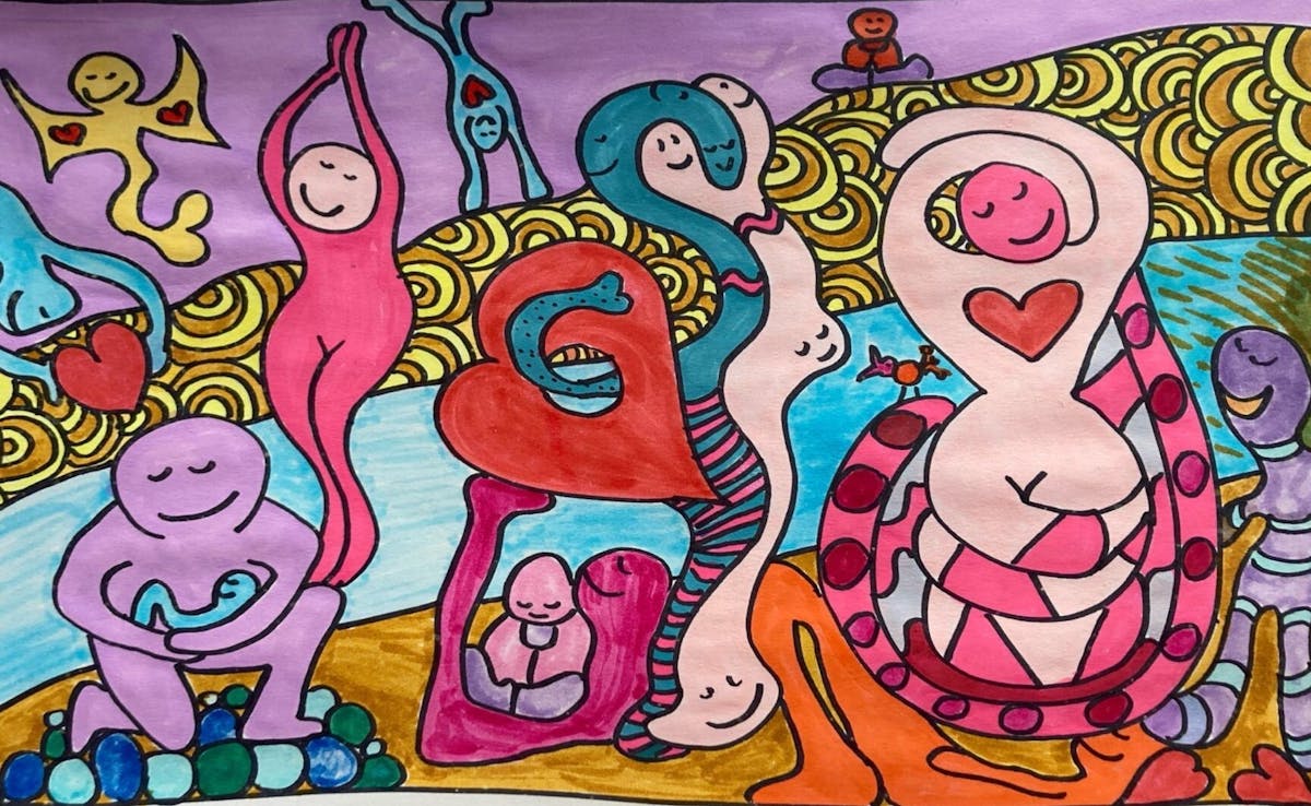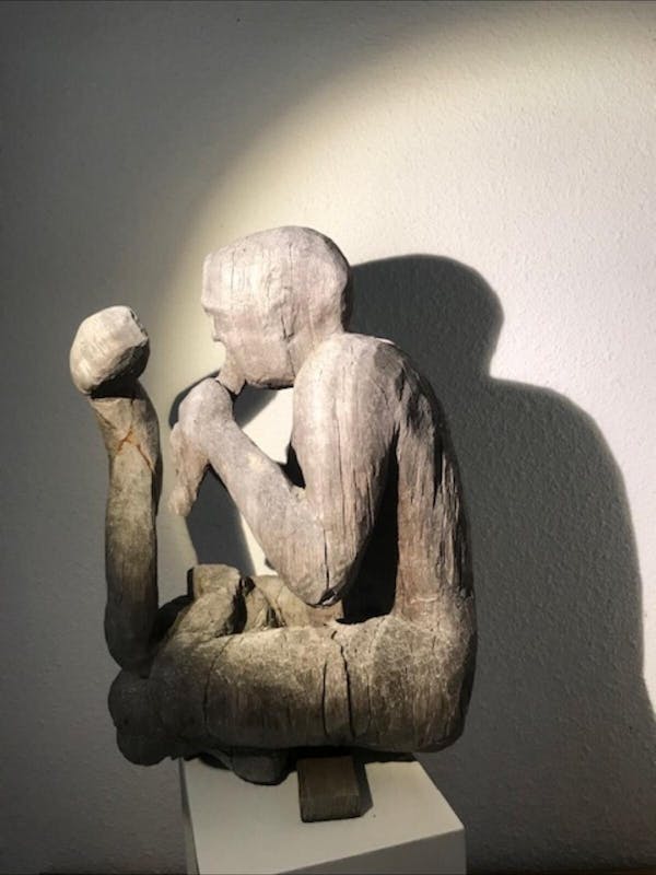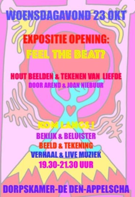 Te zien zijn allerlei kunstzinnige beelden en creaties van allerlei soorten hout, gemaakt door Arend en kleurrijke tekeningen van de hand van Joan.
