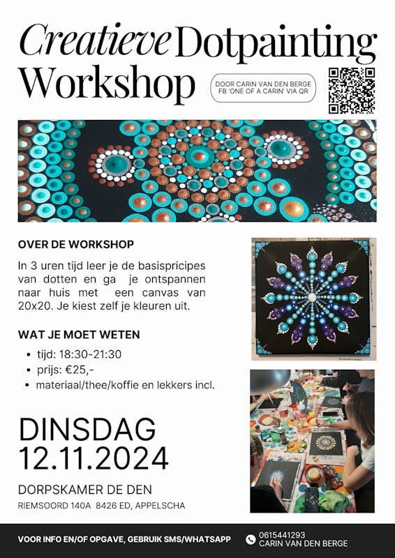 In 3 uren tijd leer je de basis principes van dotten en ga je ontspannen naar huis met een canvas van 20x20