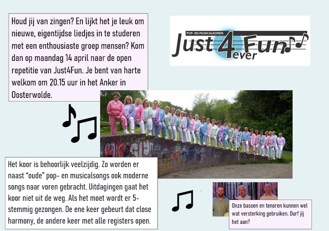 Just4Fun en 4everFun zijn swingende, enthousiaste en eigentijdse koren uit het Friese Oosterwolde. Wij zijn 2 enthousiaste pop- en musica...... Lees meer