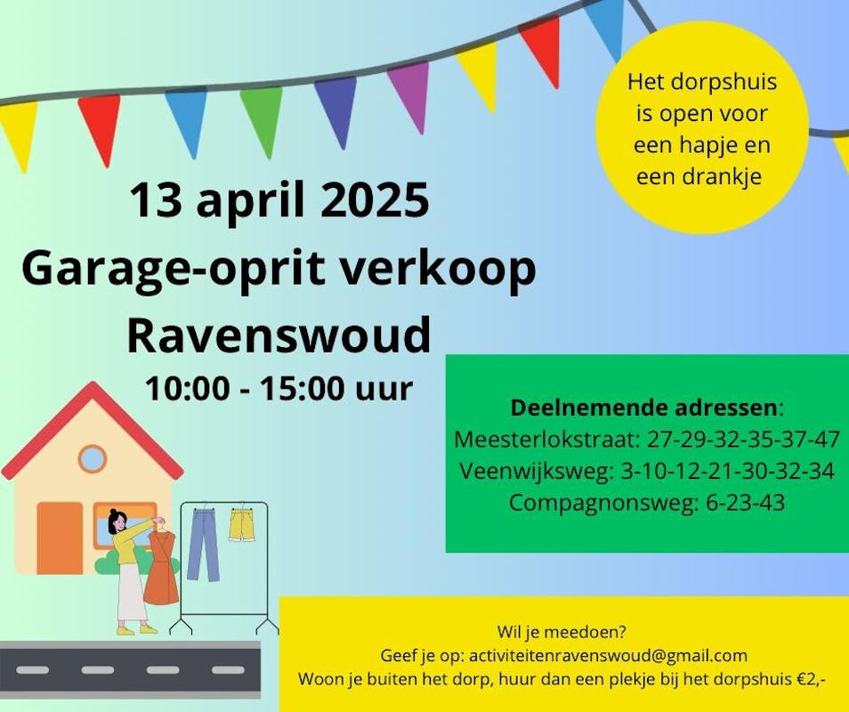Zondag 13 april is er een gezellige garage sale in Ravenswoud. Meerdere inwoners verkopen spullen vanuit hun garage/ oprit. De deelnemers zijn te herkennen aan de vlaggetjes.