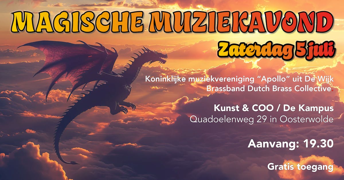 Op 5 juli worden muziekliefhebbers uitgenodigd voor een betoverende avond in De Kampus te Oosterwolde. Dit gratis concert, dat om 19.30 uur begint, brengt een unieke samenwerking tussen de koninklijke muziekvereniging "Apollo" uit De Wijk en de brassband Dutch Brass Collective.