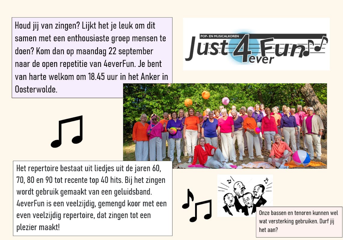 Just4Fun en 4everFun zijn swingende, enthousiaste en eigentijdse koren uit het Friese Oosterwolde. Wij zijn 2 enthousiaste pop- en musica......