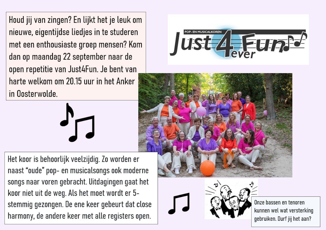 Just4Fun en 4everFun zijn swingende, enthousiaste en eigentijdse koren uit het Friese Oosterwolde. Wij zijn 2 enthousiaste pop- en musica......