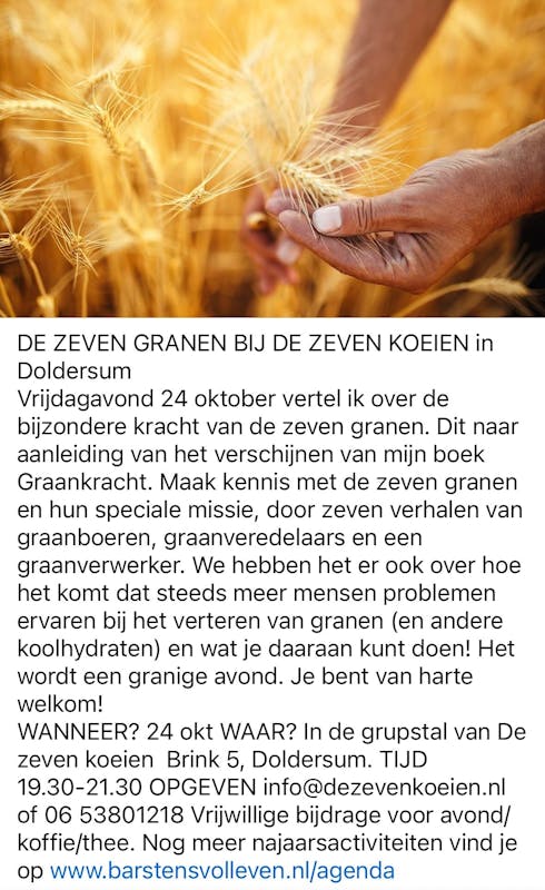 Vrijdagavond 24 oktober verteld Petra Essink over de bijzondere kracht van zeven granen. Dit naar aanleiding van het verschijnen van haar boek Graankracht. Maak kennis met de zeven granen en hun speciale missie, door zeven verhalen van graanboer, graanveredelaars en een graanverwerker. We hebben het er ook over hoe het komt dat steeds meer mensen problemen ervaren bij het verteren van granen (en andere koolhydraten) en wat je daaraan kunt doen! Het wordt een tranige avond. je bent van harte Welkom! Wanneer? 24 okt. Waar in de grupstal van De Zeven Koeien Brink 5 Doldersum Tijd 19.30-21.30