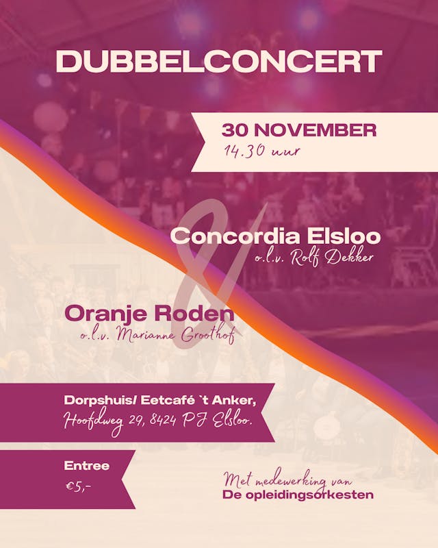 Op zondagmiddag 30 november organiseren wij samen met Oranje Roden een dubbelconcert in 't Anker in Elsloo.