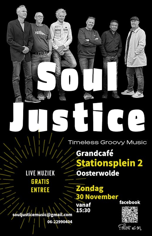 Na een succesvolle zomer, met onder meer een spetterend optreden in het Openluchttheater De Koele, is Soul Justice klaar om Oosterwolde opnieuw in beweging te brengen. De band staat garant voor tijdloze grooves, strakke ritmes en soulvolle zang – een onweerstaanbare mix van klassiekers en verrassende interpretaties die niemand stil laat staan.