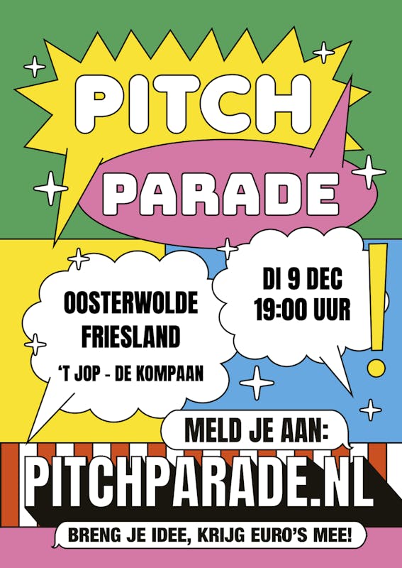 Ben jij tussen de 15 en 27 jaar? Kom je uit (de buurt van) Oosterwolde – Friesland en barst je van de creatieve ideeën? Wil je bijvoorbeeld een festival opzetten, een dancebattle organiseren, een community garden starten, een leesclub beginnen of een ander geweldig initiatief tot leven brengen? Dit is jouw kans! Tijdens de Pitch Parade in Oosterwolde – Friesland kun jij jouw idee pitchen voor een jongerenjury én maak je kans op maximaal € 2.500 voor jouw project. Keunstwurk helpt je met het uitwerken van je idee en VSBfonds om je financieel te ondersteunen en jouw dromen waar te maken. Tijdens deze gezellige avond wordt in totaal € 5.000 verdeeld aan sociale en culturele plannen.