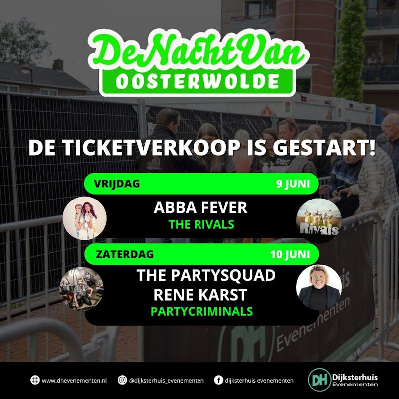 Op 9 en 10 juni is het zo ver: “De nacht van Oosterwolde!”. De 38ste editie zal een nog groter spektakel worden! Met op vrijdag de beste ABBA coverband A*Fever! Zij zijn bekend geworden van het progamma The Tribute, en spelen alle welbekende ABBA klassiekers! Naast A*Fever staat coverband The Rivals te vlammen op het podium! De top coverband heeft een breed scala aan muziek dat je zeker niet laat stilstaan!